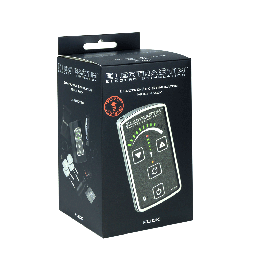 Het ElectraStim Flick Stimulator Multi-Pack – EM60-M bevat 3 accessoires, een ElectraStim Flick stimulator met één kanaal, een Aura Silicone sonde, een aantal geleidende pads en alle benodigde draden en een oplader om meteen te kunnen spelen.