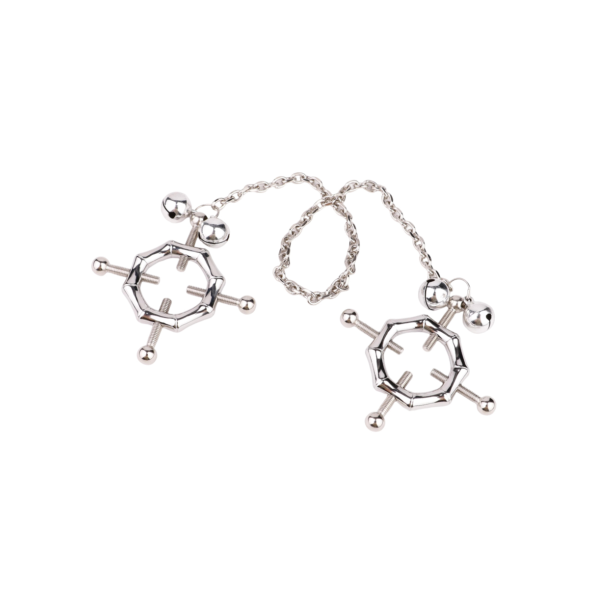 Breng je zintuiglijke spel naar een hoger niveau met deze Zeshoekige Tepelklemmen met speelse belletjes. Gemaakt van duurzaam roestvrij staal, bieden deze klemmen een opvallend ontwerp en verstelbare schroeven, zodat je de druk kunt aanpassen voor een persoonlijke ervaring.
