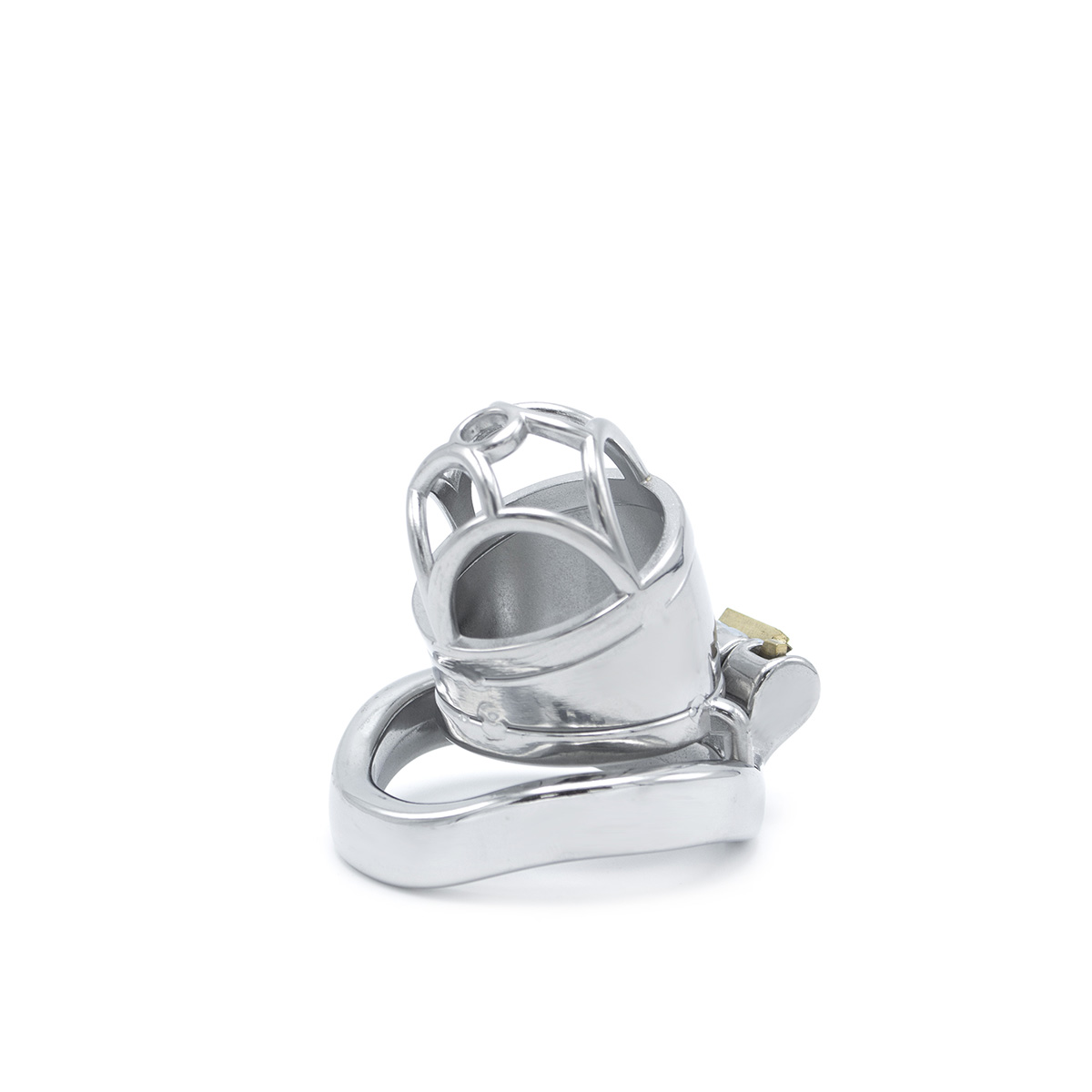 Houd je pik achter slot en grendel met deze echte stalen kuisheidskooi. Deze kleine korte kuisheidskooi is gemaakt van roestvrij staal. Sluit je lul op in dit prachtige futuristische apparaat. Plaats uw penis in de kooi met een inbrengmaat van ongeveer 4.2 cm.