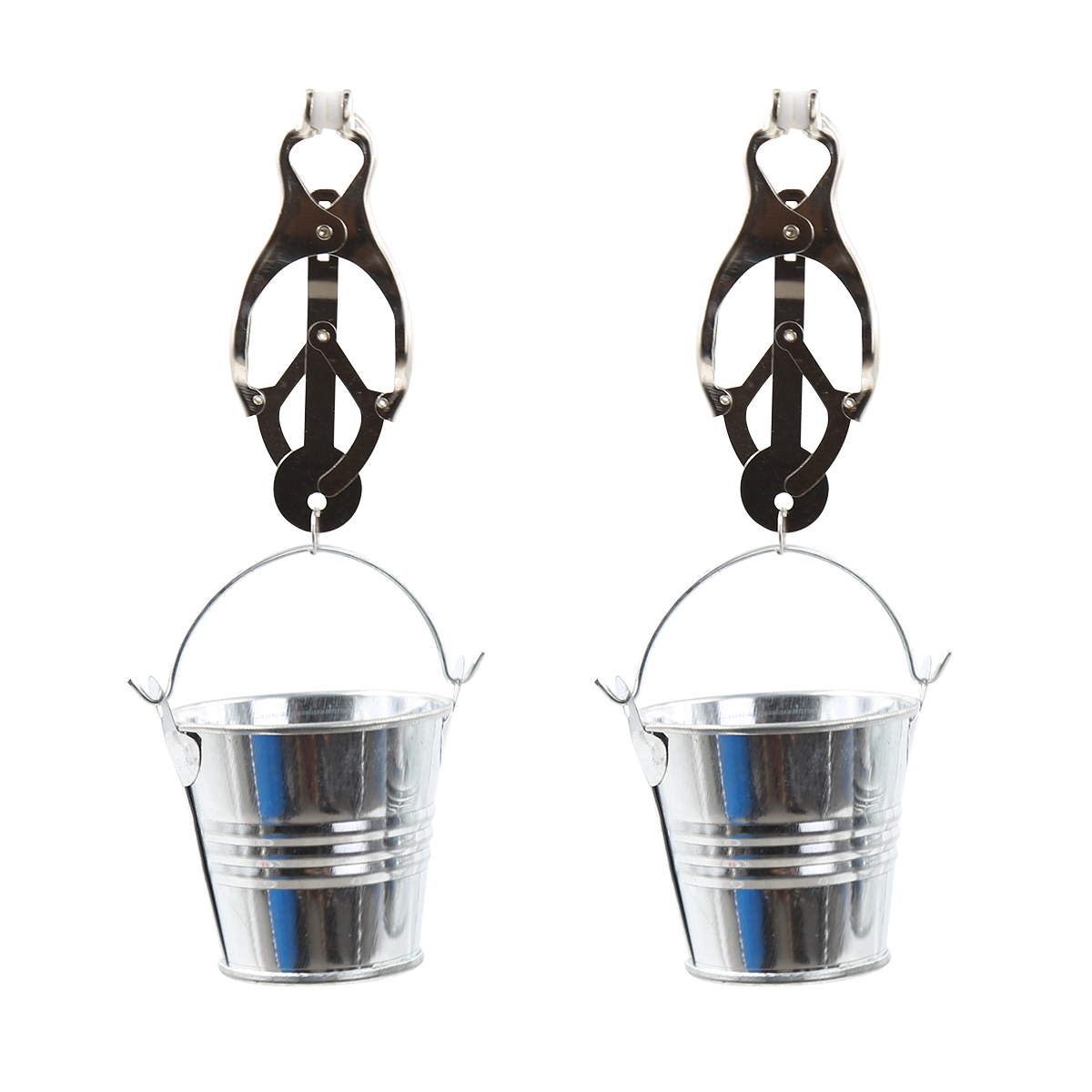 Schattige en ondeugende tepelklemmen met mini-emmertjes. Deze speelse klemmen bieden je de mogelijkheid om creatief te zijn—vul de kleine emmertjes met vloeistoffen zoals water, of andere items naar keuze voor extra plezier. De klemmen geven een zachte druk, terwijl de bungelende emmertjes zorgen voor extra gewicht en visuele aantrekkingskracht, ideaal om elke rollenspelervaring spannender te maken. (Geleverd in een doos). Durf jij het aan?