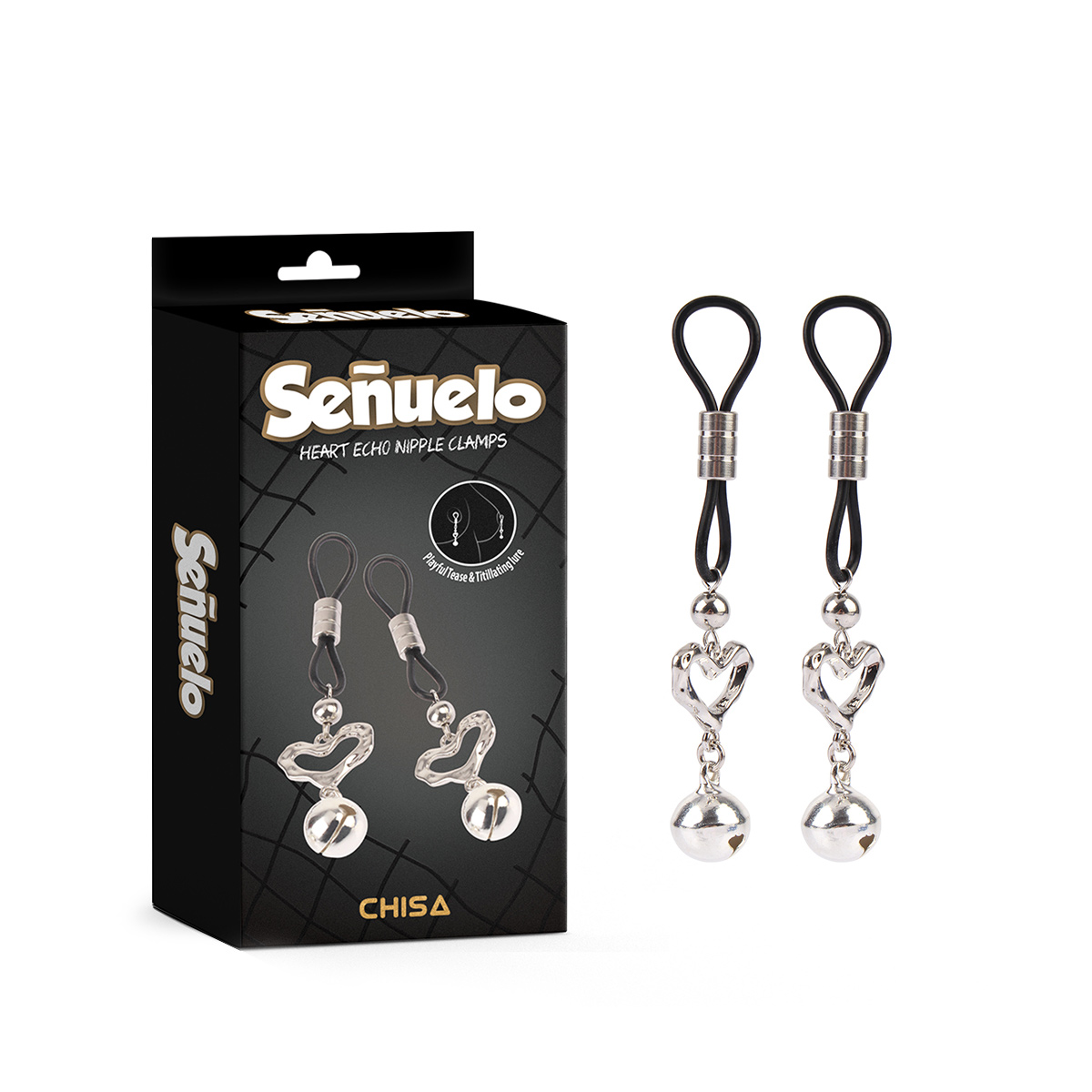 Introductie van de Heart Echo Tepelklemmen, een heerlijke toevoeging aan je collectie voor degenen die houden van een vleugje speelse knik. Deze tepelklemmen zijn voorzien van twee kleine siliconen banden met een decoratief zinken hart en een bel die aan elke klem hangt, wat een uniek gevoel van druk en plezier op je tepels geeft.
