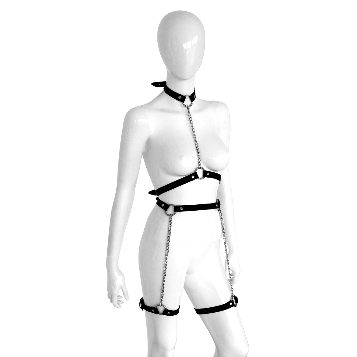Ideaal voor wie gedurfde stijlen en beperking wil ontdekken, biedt het Leren Ketting Harnas met Beenbanden zowel functionaliteit als een uitdagende esthetiek.