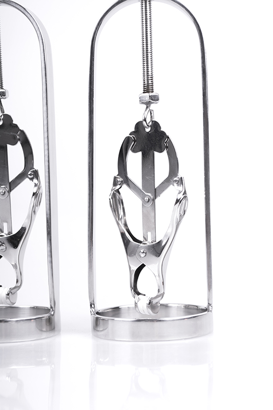 Dit is een verwoestend klein apparaat dat bestaat uit een stalen ring die rond de borst zit met een stalen frame die een tepelklem en een schroefapparaat bevat. Bij het monteren is de spanning op de tepel getrokken die hem vasthoudt, terwijl hij langzaam draait trekt en rekt de nippel om het gewenste effect te bereiken. Kan ook op andere gevoelige lichaamsdelen worden gebruikt om de intensiteit te verhogen. Gemaakt van roestvrij staal.